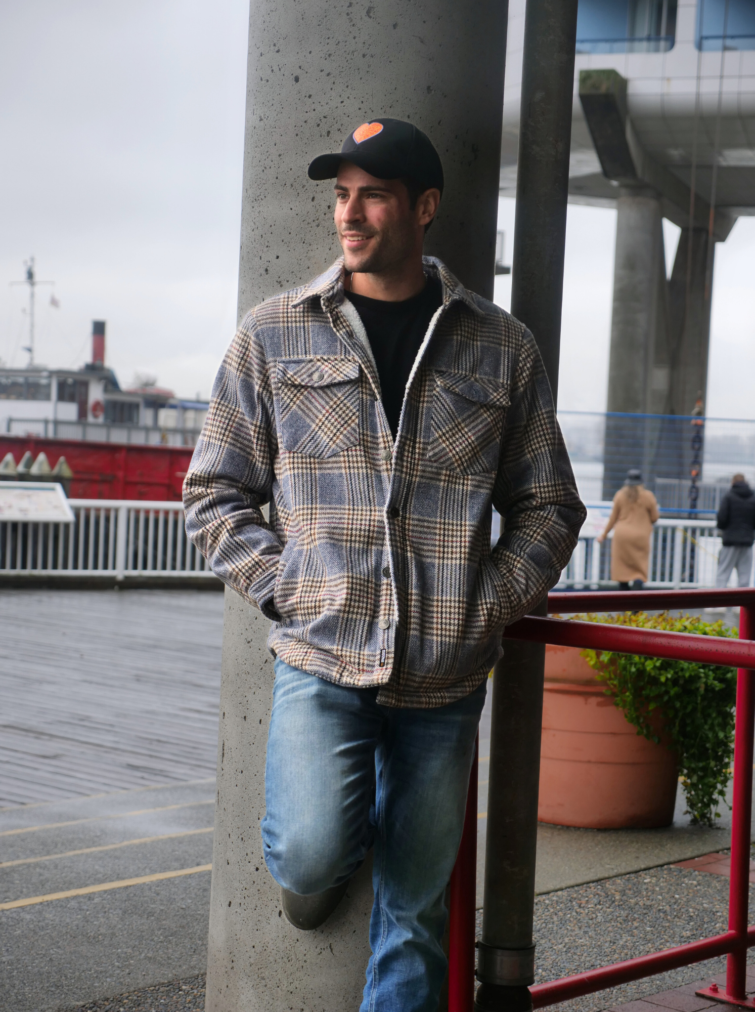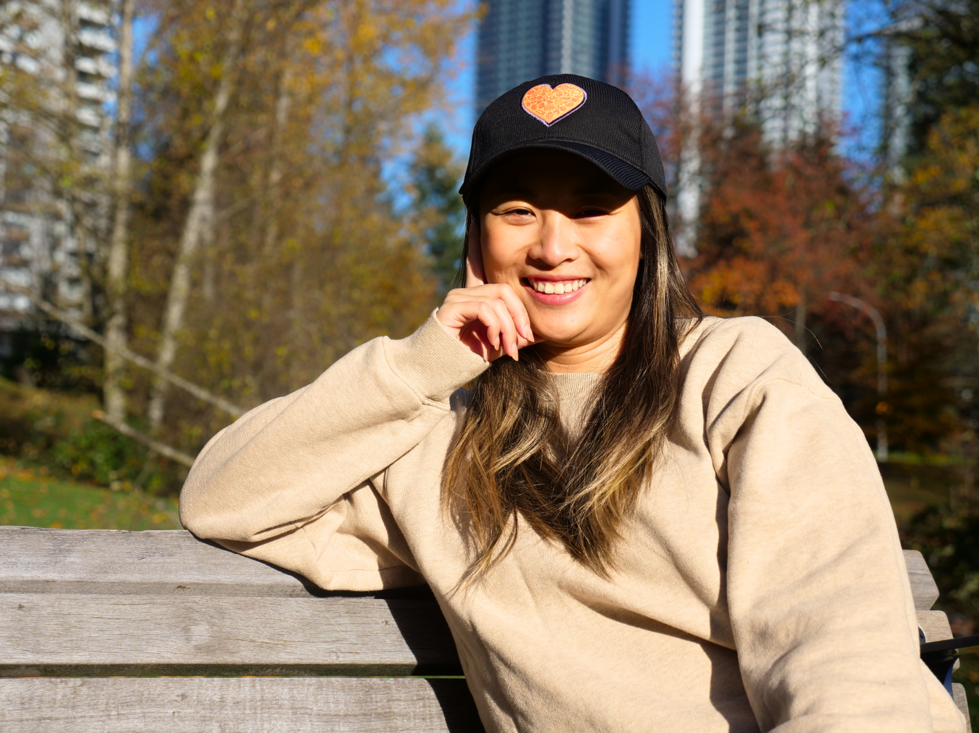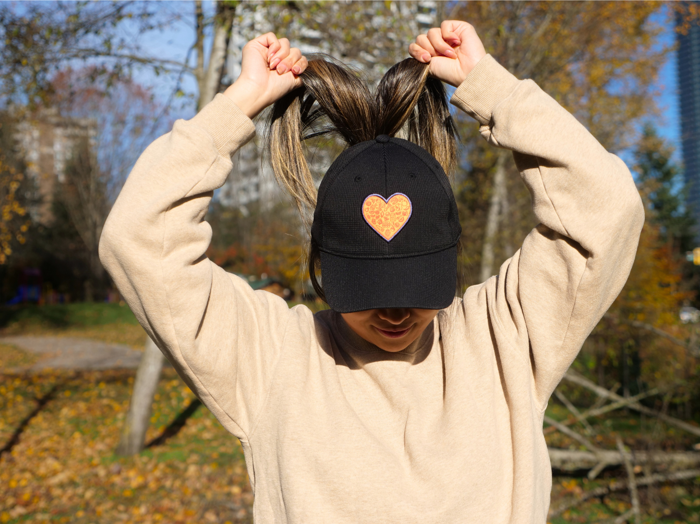 Heart logo on front center panel – Embroidered outline of the heart with orange gradient DTG design.